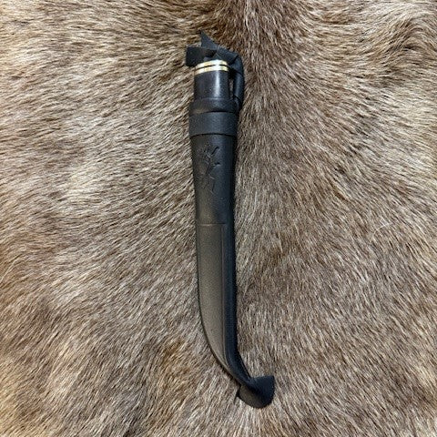 Jakt och fiskekniv i björk med mörkbrun infärgning och nitad metalltopp. Den är 26 cm lång i hölstret och knivbladet blankpolerat mäter 90 mm. Ej Risfjelltillverkad men finns i vårt utbud i vår butik Risfjells Sameslöjd i Vilhelmina södra Lappland.